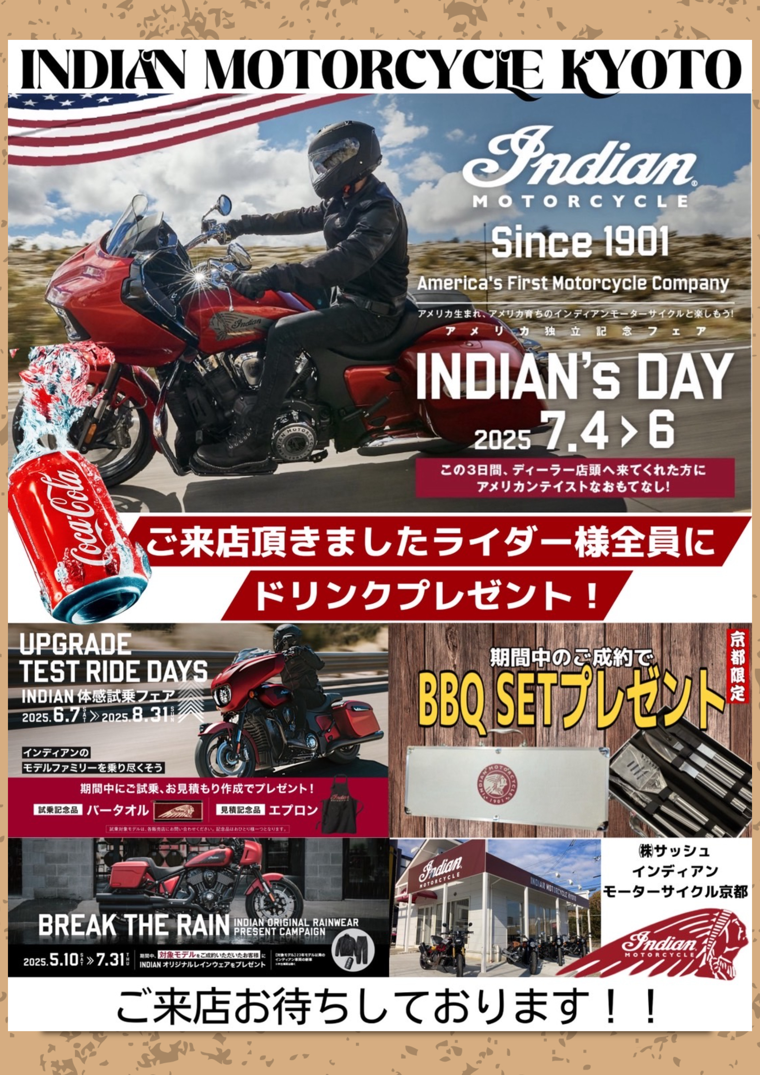 まいどおおきに サッシュのキャブ好き兼インディアン担当のあずまです('ω')ノ イベントのお知らせーーッ!! 7月4.5.6日(3日間) アメリカ独立記念日パーティーを開催致します インディアンオーナー様を初め、期間中にご来店頂きましたお客様全員にコカ・コーラやドクターペッパー等のアメリカンテイストなウェルカムドリンクをプレゼント! 更にご試乗でインディアングローブ・お見積もりでエプロンもプレゼント! 更にさらに(すごいな)ご成約でインディアンロゴ入りBBQセットとレインウェア(4万円相当)もプレゼント そしてインディアンオーナー様限定のアパレル5,000円引きクーポンも当日利用可能(/・ω・)/ 京都店名入りのTシャツもご予約承り中...(/・ω・)/ 因みに購入を検討中のお客様で3年以内に大型二輪免許(MT)を3年以内に取得または取得予定のお客様限定で車体価格10万円引きのサポートも併用可能でス! 周りのライダー様でインディアンが気になる...という方に是非ご紹介をお願い致します 3日間、みんなで全力で楽しんじゃいましょう! 皆様のご来店をお待ちしております('ω')ノ