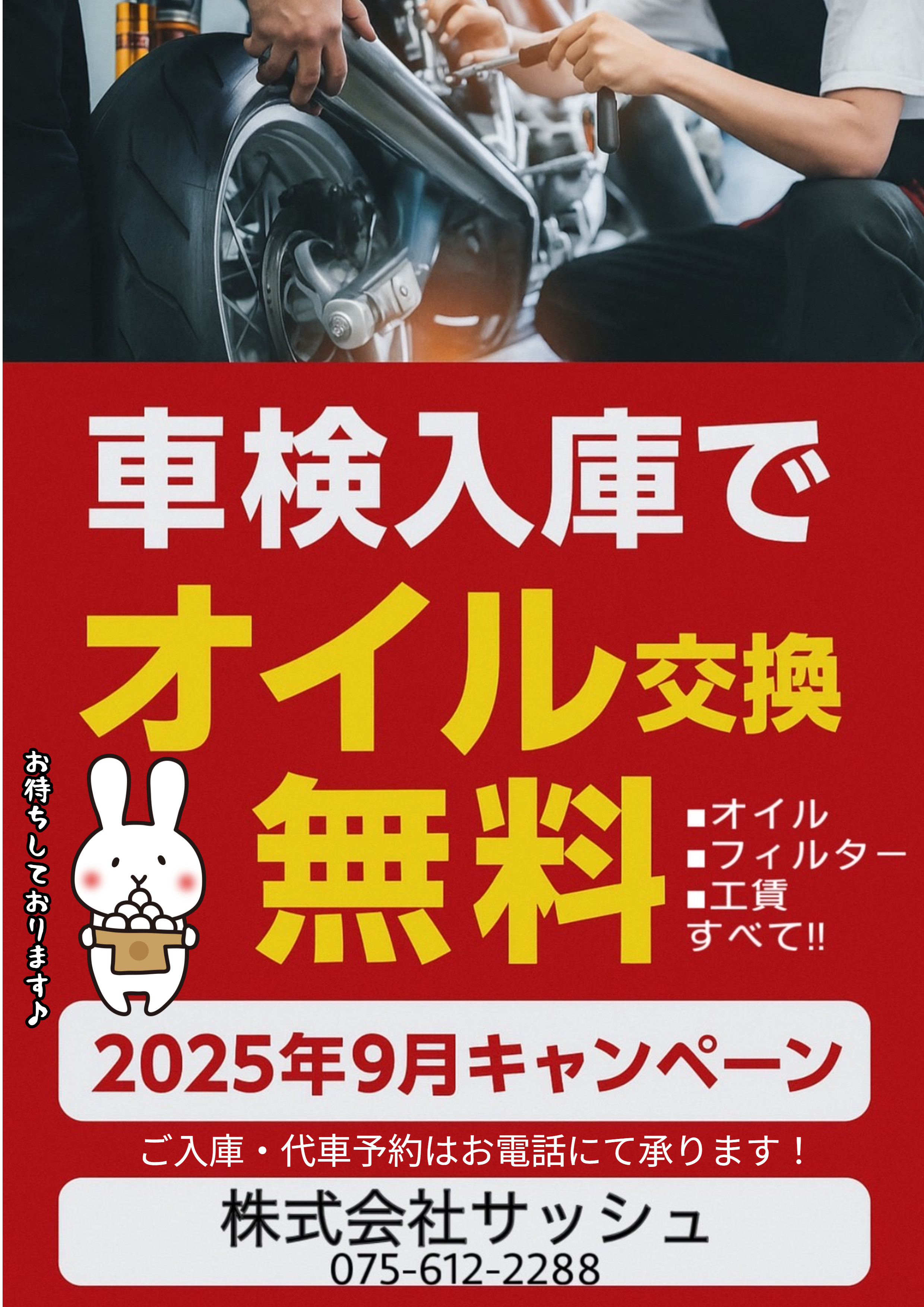 車検入庫頂きましたお客様限定で、エンジンオイル交換無料!!