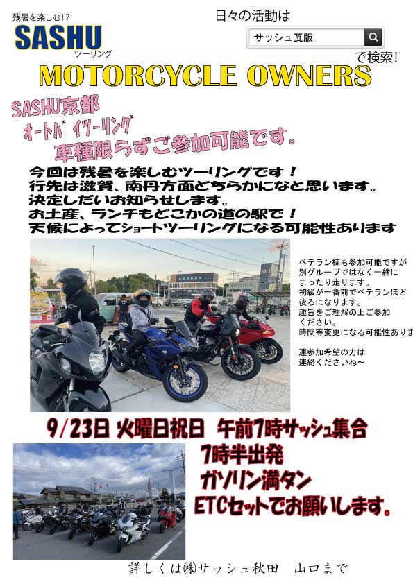ツーリング、イベント、新製品情報、裏ネタ!? 満載でお届けする、新しいサッシュ・ブログ |